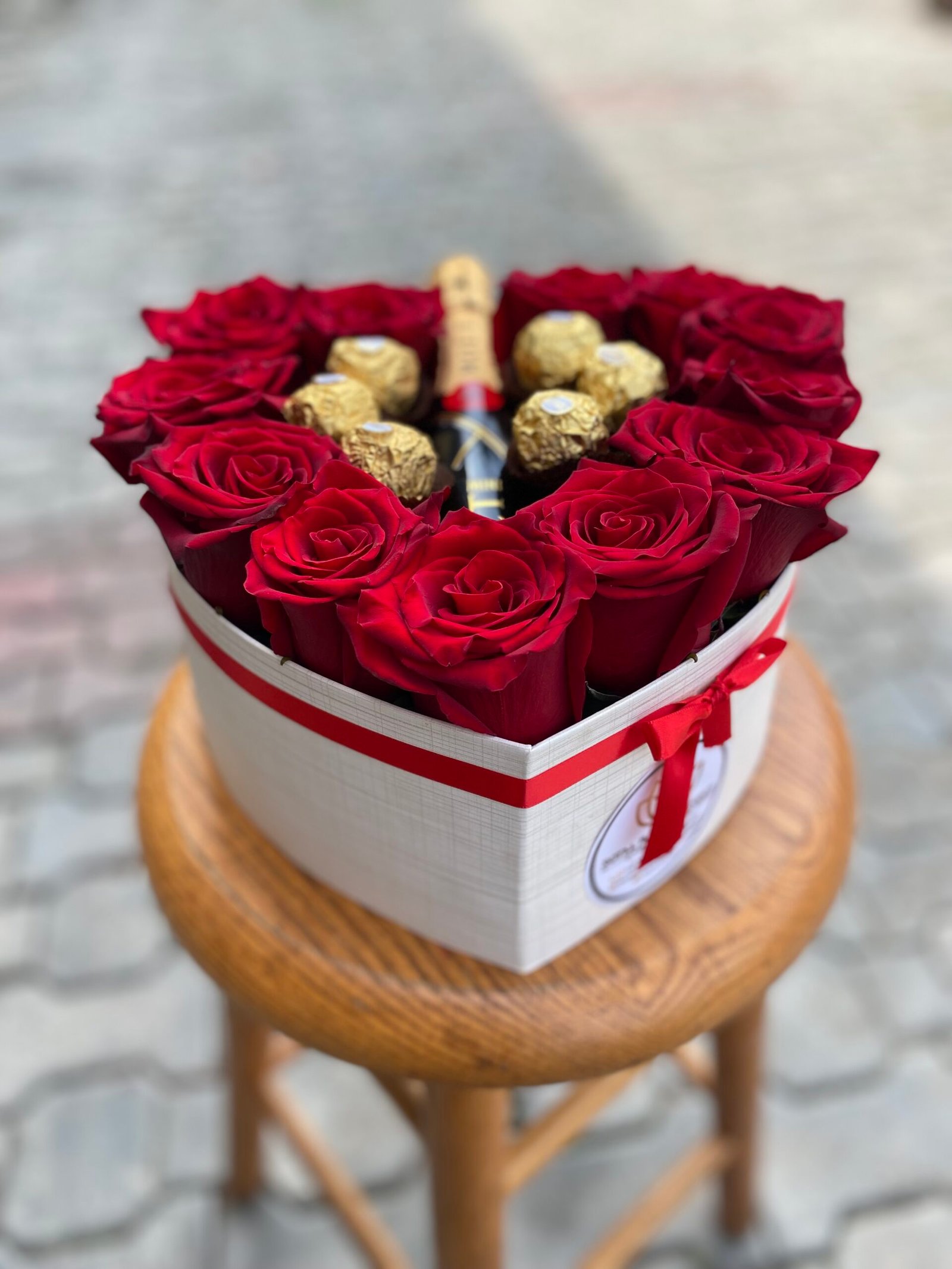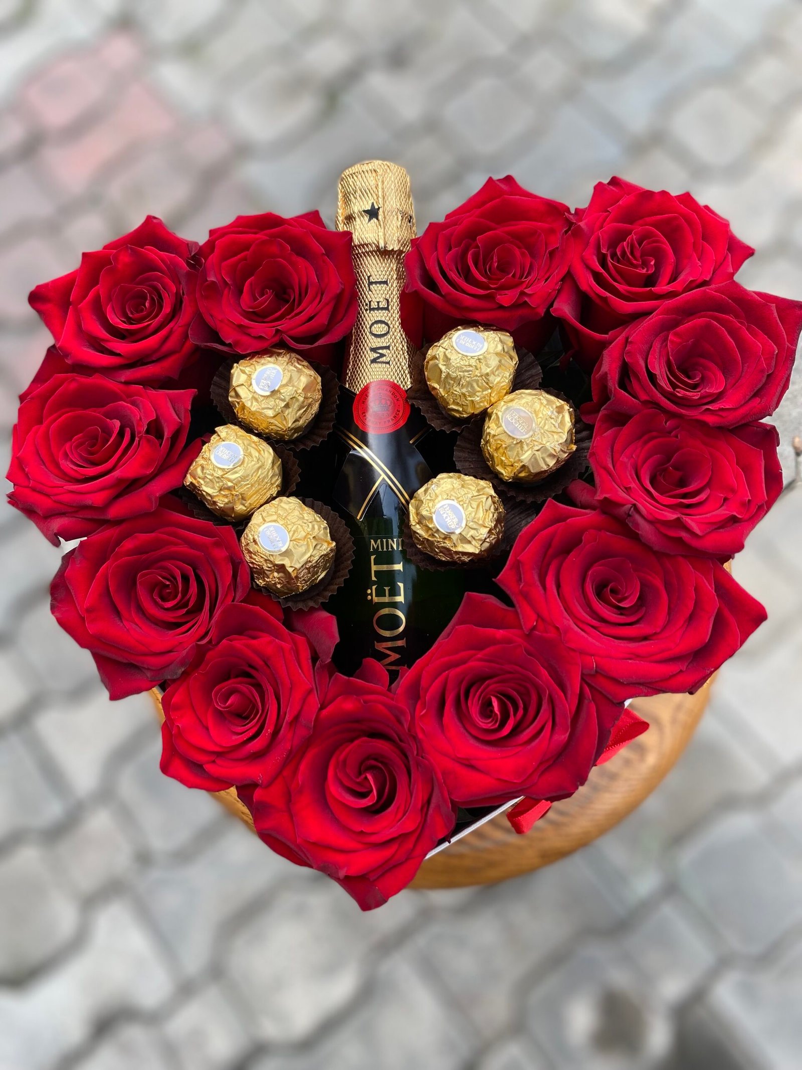 Inside, you’ll find hand-picked fresh red roses arranged to perfection, a mini bottle of luxurious Moet champagne, and everyone’s favorite Ferrero Rocher chocolates. Together, these elements create a perfectly curated gift for any occasion.