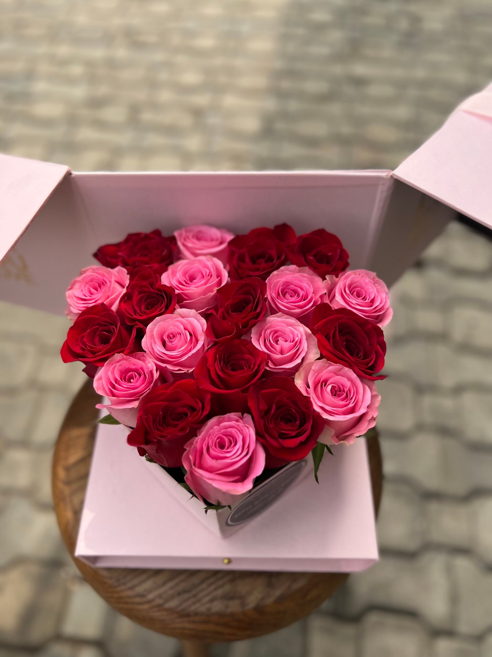 Delight your loved ones with an exquisite mix of pink and red roses arranged beautifully in a pastel pink box. This charming combination symbolizes grace, admiration, and love—perfect for any occasion.