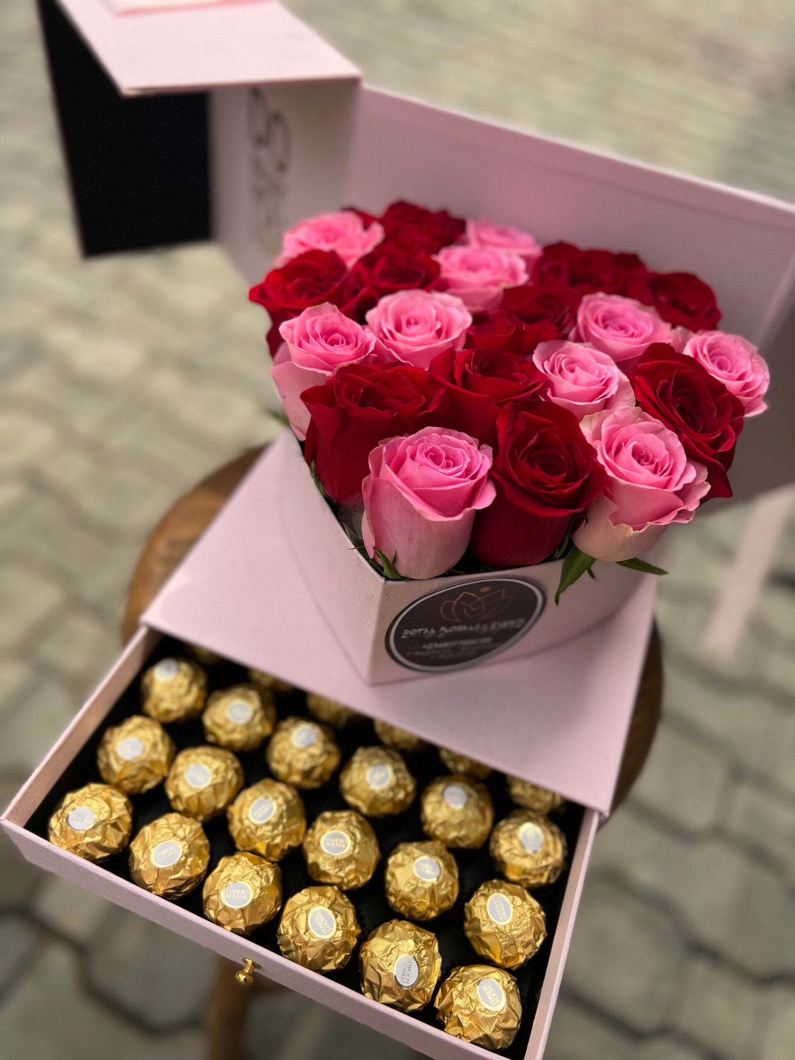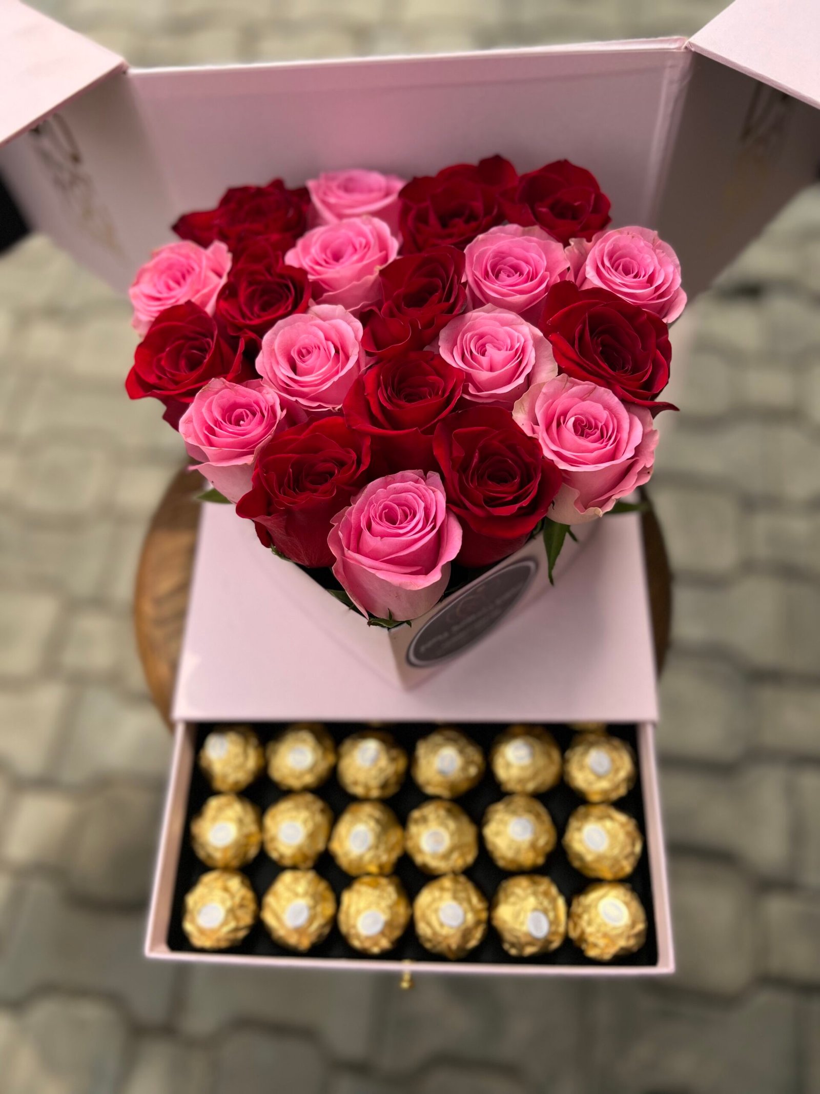 Adding to its allure, the pink box features a hidden drawer filled with Ferrero Rocher chocolates. Indulge in the rich, creamy hazelnut flavor paired with the timeless beauty of fresh roses—an irresistible combination that makes gifting extra special.