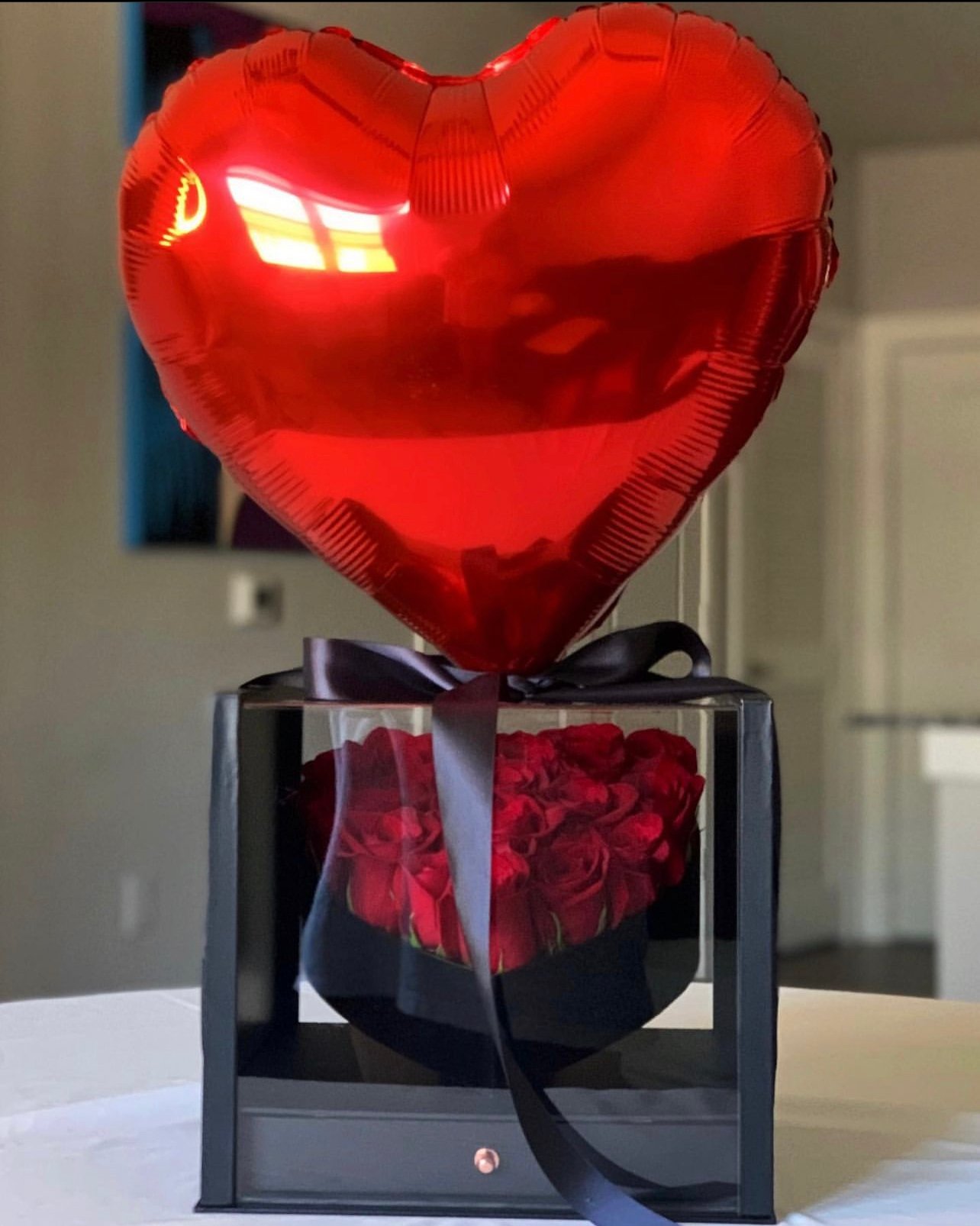 Beneath the vibrant roses lies a hidden drawer containing the world-renowned Ferrero Rocher chocolates. A delectable treat that complements the beauty of the flowers, offering a delightful sensory experience for your loved one.